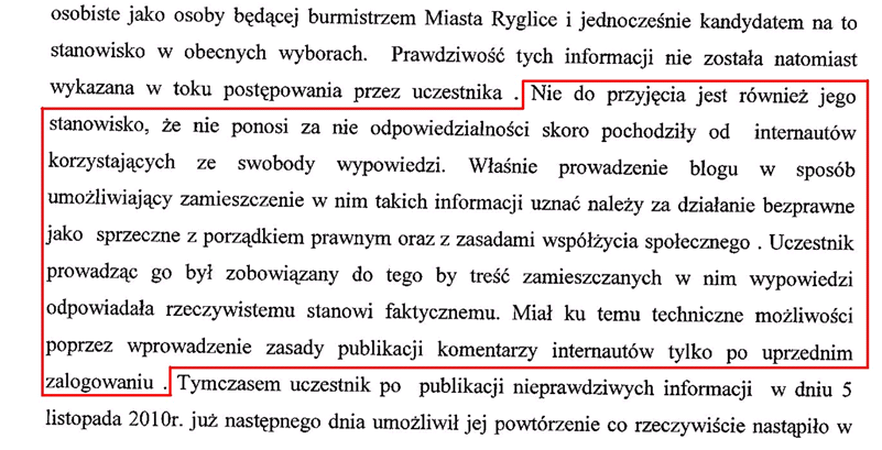 Artykuł 05.06.2020 8 min. czytania Tekst Image Dziesięć lat temu Sąd Okręgowy w Tarnowie uznał za bezprawne prowadzenie bloga, na którym czytelnicy mogli zamieszczać swoje komentarze bez wcześniejszej rejestracji. Zdaniem sądu umożliwiło to publikację zniesławiającego komentarza przez anonimowego internautę. Europejski Trybunał Praw Człowieka stwierdził właśnie w wyroku Jezior p. Polsce, że doszło w tej sprawie do naruszenia wolności słowa w sieci. Jednocześnie Strasburg dołożył kolejną cegiełkę do bardzo aktualnej dzisiaj dyskusji o reformie zasad odpowiedzialności administratorów portali za treści publikowane przez ich użytkowników. Fakty Andrzej Jezior pisze na blogu o lokalnych problemach gminy Ryglice, czasem krytycznie o działaniach władz samorządowych. Przed wyborami samorządowymi w 2010 r. na jego blogu, pod jednym z artykułów dotyczących wyborów, pojawił się komentarz, którego autor zarzucał ówczesnemu burmistrzowi Ryglic (i jednocześnie kandydatowi na to stanowisko w zbliżających się wyborach) popełnienie szeregu przestępstw oraz przynależność do „bandyckiej rodziny”. Zarzuty te nie miały żadnego pokrycia w rzeczywistości. Bloger tego samego dnia usunął zniesławiający komentarz. Tak samo postąpił z kolejnymi komentarzami, w których anonimowy autor powtarzał swoje zarzuty. Bloger wprowadził też tymczasowo wymóg zalogowania się przed dodaniem komentarza. Zrezygnował z niego jednak, kiedy zauważył, że czytelnicy przestali zostawiać swoje komentarza. Pomimo szybkiej reakcji blogera burmistrz wytoczył Andrzejowi Jeziorowi proces w trybie wyborczym. Polskie sądy uznały, że jako administrator bloga Jezior ponosi odpowiedzialność za opublikowany na nim komentarz. Zdaniem sądów przez to, że nie wymagał od komentujących rejestrowania się ani nie stosował żadnych innych mechanizmów kontroli prewencyjnej w stosunku do ich wpisów (takich jak np. automatyczne filtrowanie treści czy uprzednia autoryzacja zamieszczanych komentarzy), nie dopełnił swoich obowiązków, tj. nie zapobiegł publikacji zniesławiającej informacji. Sąd nakazał blogerowi przeprosić burmistrza na swoim blogu, zapłacić kwotę 5 tys. zł na cel społeczny i obciążył go kosztami postępowania. Zbliżają się wybory. Czy muszę zamknąć bloga? Sprawa trafiła do Trybunału w Strasburgu, który inaczej niż polski sąd ocenił zakres obowiązków i odpowiedzialności administratora bloga za komentarze dodawane przez czytelników. Uznał, że obciążenie blogera odpowiedzialnością stanowiło w tym przypadku nieproporcjonalną ingerencję w swobodę wypowiedzi i mogło wywołać „efekt mrożący” dla obiegu informacji w sieci. Trybunał wziął pod uwagę następujące okoliczności: charakter prowadzonego bloga: autor działał non profit, jego blog traktował o sprawach ważnych dla społeczności lokalnej, a z uwagi na taką grupę docelową – w praktyce miał stosunkowo ograniczony zasięg; fakt, że zniesławiający komentarz nie był bezpośrednią reakcją na wpis blogera: nie można uznać, że w jakikolwiek sposób zachęcał on czy prowokował do jego zamieszczenia; szybka reakcja blogera na bezprawny komentarz, w szczególności niezwłoczne usuwanie go ze strony za każdym razem, gdy się pojawiał; kontekst wypowiedzi atakującej burmistrza: komentarz był „tylko” zniesławieniem, a nie bardziej skrajnym nadużyciem, za które co do zasady Trybunał uznaje np. mowę nienawiści czy nawoływanie do przemocy (taką konkluzję można wyciągnąć, patrząc również na wcześniejsze orzecznictwo Trybunału dotyczące odpowiedzialności pośredników); kwestia możliwości pociągnięcia do odpowiedzialności autora spornego komentarza: w tym przypadku nie wykazano, aby burmistrz podjął starania, aby tę osobę w ogóle zidentyfikować i rozpocząć przeciwko niej działania prawne. Zamiast tego od razu uderzył w blogera. Nie można więc stwierdzić, że nie było możliwe ukaranie autora komentarza, który w pierwszej kolejności powinien ponosić odpowiedzialność za własne słowa. Wyrok Trybunału oznacza, że każda osoba prowadząca bloga, który spełnia powyższe kryteria w świetle standardów strasburskich, może czuć się bezpieczna. Polskie sądy, przynajmniej teoretycznie, powinny bowiem właśnie według tych standardów interpretować ustawę o świadczeniu usług drogą elektroniczną, która na gruncie krajowym reguluje kwestie odpowiedzialności tzw. pośredników (administratorów portali) za treści dodawane przez osoby trzecie. Wymóg wprowadzenia identyfikacji osób dodających komentarze czy innych środków sugerowanych przez polskie sądy w sprawie A. Jeziora, które miałyby na celu niedopuszczenie do publikacji bezprawnych treści przez czytelników, Trybunał uznał za „nadmierny” i wręcz „nierealistyczny”. Zmiana regulacji dotyczących moderacji treści Warto spojrzeć jednocześnie na szersze implikacje, które może mieć omawiany wyrok. Obecnie na poziomie Unii Europejskiej toczą się pracę nad tzw. kodeksem usług cyfrowych (Digital Service Act). Jedną z dyskutowanych kwestii jest reforma reguł rządzących moderacją treści przez administratorów stron internetowych, które dziś na poziomie UE reguluje dyrektywa o handlu elektronicznym. W ostatnich dniach tematyka ta stała się głośna także za oceanem za sprawą rozporządzenia wykonawczego wydanego przez Donalda Trumpa po „starciu” z Twitterem. Czy wyrok ws. Jezior p. Polsce wskazuje jakikolwiek kierunek, w którym powinny podążać nowe reguły odpowiedzialności portali za treści publikowane przez ich użytkowników? Uzasadnienie wyroku nie jest zbyt rozbudowane, ale biorąc pod uwagę także wcześniejsze orzecznictwo ETPCz dotyczące odpowiedzialności pośredników (Delfi p. Estonii, Magyar Tartalomszolgáltatók Egyesülete and Index.hu Zrt p. Węgrom czy Pihl p. Szwecji), 