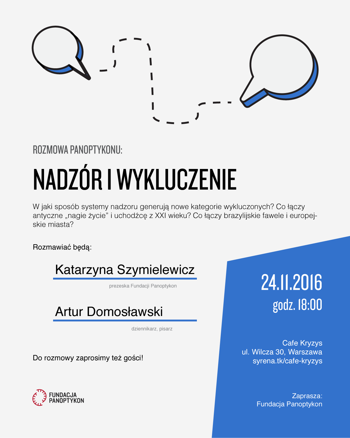 Artykuł 16.11.2016 1 min. czytania Tekst Image Nadzór i wykluczenie to zjawiska powiązane, nierzadko wzajemnie się potęgujące. W relacji człowieka z władzą nadzór to narzędzie opresyjne: służy skontrolowaniu i skorygowaniu zachowania, które władza z jakiegoś powodu uznała za niepożądane. Przestępczość, narkotyki, zagrożenie terrorystyczne, bezdomność, choroby – w bardzo różnych kontekstach pojawiają się podobne mechanizmy nadzoru. A wraz z nimi nowe kategorie wykluczonych: ludzi, którzy przez system nadzorujący są traktowani gorzej, z podejrzliwością, a czasem przyzwoleniem na przemoc. By w Europie znaleźć się poza faktyczną ochroną prawa, nie trzeba być syryjskim uchodźcą – coraz częściej wystarczy podejrzenie o działalność terrorystyczną, nawet nieuzasadnione. Pełnoprawni obywatele i wykluczeni żyją na innych planetach, jednak przejście z jednej do drugiej rzeczywistości może być gwałtowne. I bynajmniej nie zasłużone. Kim są wykluczeni w XXI wieku? Co sprawiło, że znaleźli się „po drugiej stronie”? Co łączy brazylijskie fawele i europejskie miasta? O związkach między wykluczeniem i nadzorem Katarzyna Szymielewicz będzie rozmawiać z Arturem Domosławskim – dziennikarzem i pisarzem, autorem m.in. książki pt. „Wykluczeni” (wyd. Wielka Litera, 2016), w której zbiera historie ludzi napotkanych w podróżach po krajach globalnego Południa. Kiedy: czwartek, 24 listopada 2016 r., godz. 18:00 – 19:30 Gdzie: Cafe Kryzys, ul. Wilcza 30, Warszawa (wejście w bramie po lewej stronie) Anna Obem Autorka Temat dyskryminacja Poprzedni Następny Newsletter Otrzymuj informacje o działalności Fundacji Twoje dane przetwarza Fundacja Panoptykon w celu promowania działalności statutowej, analizy skuteczności podejmowanych działań i ewentualnej personalizacji komunikacji. Możesz zrezygnować z subskrypcji listy i zażądać usunięcia swojego adresu e-mail. Więcej informacji o tym, jak przetwarzamy twoje dane i jakie jeszcze prawa ci przysługują, w Polityce prywatności. Zapisz się Zapisz się Akceptuję Regulamin usługi Leave this field blank Zobacz także Artykuł Dzień Kobiet – w Panoptykonie dzień jak co dzień Przymus badań ginekologicznych, rejestr ciąż, dyskryminujące algorytmy uczenia maszynowego, targetowanie reklam politycznych na kobiety w ciąży, aktywistki zatrzymywane przez służby, życie intymne kobiet pod obserwacją firm z branży reklamowej – działania związane z nadzorem nad kobietami to w… 08.03.2023 Tekst Podcast Kiedy twarz staje się kluczem. Rozmowa z dr Magdaleną Tomaszewską-Michalak Na szczeblu europejskim trwa właśnie dyskusja o wprowadzeniu zakazu masowego rozpoznawania twarzy. Jak działa technologia rozpoznawania twarzy? Gdzie jest używana? W jakim celu sięga po nią policja i z jakimi kosztami społecznymi się wiąże? Co możemy zyskać, a co stracić, jeżeli w porę nie… 18.06.2020 Dźwięk Artykuł Technologia bez „docelowego odbiorcy” [recenzja] Czy da się zebrać dane, które są pozbawione kontekstu i zebrane w sposób obiektywny? Kim jest „przeciętny użytkownik”? Jeśli interesujesz się zagadnieniem wykluczania przez nową technologię, to na pewno zainteresuje cię praca Kuby Piwowara. 20.10.2023 Tekst