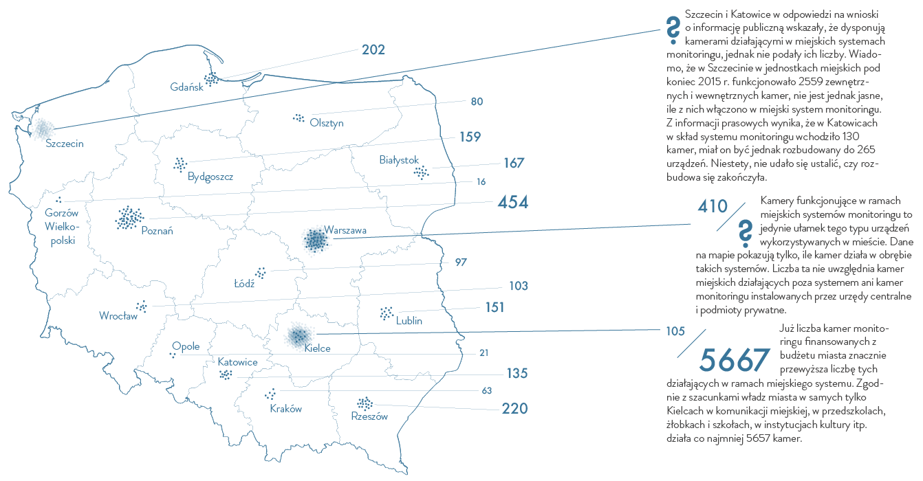 Oczywiście Dowiedz się więcejkamer finansowanych z budżetów miast jest znacznie więcej – w przypadku większych miast oficjalne szacunki mówią o kilku tysiącach. Trudno tu jednak o ścisłe i porównywalne dane, bo w każdym z miast urzędnicy liczą je na swój sposób. Niektóre na przykład w odpowiedziach na wnioski o informację publiczną wliczyły sprzęt zainstalowany w środkach komunikacji miejskiej i szkołach, inne zaś nie.