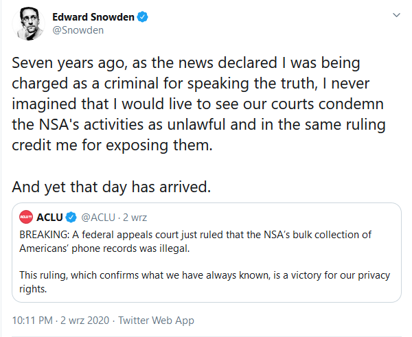 Artykuł 05.09.2020 4 min. czytania Tekst Image „Nie spodziewałem się, że dożyję chwili, kiedy sąd wyda wyrok potępiający działalność NSA” – tak Edward Snowden skomentował decyzję amerykańskiego federalnego sądu apelacyjnego, który 2 września orzekł, że masowa inwigilacja elektroniczna Amerykanów prowadzona przez Agencję Bezpieczeństwa Wewnętrznego (NSA – National Security Agency) była niezgodna z FISA (Foreign Intelligence Surveillance Act – ustawą o wywiadzie zagranicznym) i prawdopodobnie naruszała również konstytucję USA. Problem naruszania praw obywateli i obywatelek państw poza USA oraz udziału innych państw, w tym Polski, w programach masowej inwigilacji pozostaje jednak otwarty. „To zwycięstwo dla naszego prawa do prywatności” – skomentowała z kolei organizacja ACLU, której przedstawiciele włączyli się w obronę Snowdena przed amerykańskim wymiarem sprawiedliwości. Naszą radość ze zwycięstwa przyjaciół zza oceanu przyćmiewa nieco fakt, że wyrok nie odnosi się (bo nie mógłby się odnosić) do problemu naruszania przez NSA prywatności obywateli innych państw, którą amerykańskie prawo chroni w znacznie słabszym stopniu. Jednak w dobie globalnej komunikacji rozróżnienie na prawa Amerykanów i całej reszty świata jest fikcyjne. Po pierwsze, służby nie zawsze wiedzą, jakie obywatelstwo ma podsłuchiwana osoba, a po drugie – pojawia się pytanie, czy komunikacja między obywatelami USA a innych krajów powinna być chroniona według standardów przewidzianych dla Amerykanów, czy też dla cudzoziemców. Wciąż otwarty pozostaje też problem masowej inwigilacji prowadzonej przez służby innych państw współpracujących z amerykańską NSA. Z dokumentów ujawnionych przez Snowdena dowiedzieliśmy się, że swoje za uszami w kwestii masowej inwigilacji elektronicznej ma niemal każde państwo na świecie. Niektóre, np. Wielka Brytania, prowadziły (prowadzą?) własne programy inwigilacyjne, inne (np. Polska) miały przekazywać dane amerykańskim partnerom. Drogę i motywację Snowdena, byłego analityka NSA, który w 2013 r. wykradł dokumenty o działalności najlepiej strzeżonej agencji świata i przekazał je dziennikarzom m.in. Guardiana opowiedziała Laura Poitras w nagrodzonym Oscarem dokumencie Citizenfour. Fanów i fanki prywatności z pewnością zaciekawi wątek tego, jak trudno sygnaliście było bezpiecznie skontaktować się z nieumiejącymi szyfrować maili dziennikarzami. Sam Edward Snowden, oskarżony o szpiegostwo, pozostaje na wygnaniu – powrót do kraju może umożliwić mu jedynie ułaskawienie z rąk prezydenta Donalda Trumpa, który zapowiedział, że przygląda się sprawie. Zdania w tej sprawie są podzielone: dla jednych sygnalista i bohater, dla innych niebezpieczny „samozwańczy sprawiedliwy”, którego ułaskawienie zachęciłoby kolejnych mu podobnych do narażania na ryzyko „życia i interesów Amerykanów”. Dla nas: człowiek, który sprawił, że więcej osób zainteresowało się działaniami służb i zaczęło domagać się nad nimi kontroli. Polecamy Panoptykon: Snowden i Greenwald: Polskie władze współpracowały z NSA Panoptykon: Pamiętajmy o Snowdenie (i ujawnionej przez niego masowej inwigilacji) Panoptykon: Snowden, fakty o inwigilacji i piekło, którego nie ma Panoptykon 4.0: Jak osiodłać Pegaza. Rozmowa z Jackiem Cichockim i Wojciechem Klickim Panoptykon: Czy ABW współpracowała z amerykańską NSA? Nie wiemy i się nie dowiemy Szmer: Amerykański sąd: Program masowych podsłuchów ujawniony przez Snowdena był nielegalny Spider's Web: Snowden miał rację. Działania NSA uznane za nielegalne przez Okręgowy Sąd Apelacyjny Anna Obem, Wojciech Klicki Wesprzyj nasze działania na rzecz większej kontroli nad służbami. Przekaż darowiznę i 1% podatku (KRS: 0000327613)! Anna Obem Autorka Temat programy masowej inwigilacji Poprzedni Następny Newsletter Otrzymuj informacje o działalności Fundacji Twoje dane przetwarza Fundacja Panoptykon w celu promowania działalności statutowej, analizy skuteczności podejmowanych działań i ewentualnej personalizacji komunikacji. Możesz zrezygnować z subskrypcji listy i zażądać usunięcia swojego adresu e-mail. Więcej informacji o tym, jak przetwarzamy twoje dane i jakie jeszcze prawa ci przysługują, w Polityce prywatności. Zapisz się Zapisz się Akceptuję Regulamin usługi Leave this field blank Zobacz także Artykuł Polskie służby inwigilują bez kontroli. ETPC zażądał wyjaśnień od rządu Europejski Trybunał Praw Człowieka zwrócił się do polskiego rządu o przedstawienie wyjaśnień w sprawie inwigilacji prowadzonej przez służby specjalne. To efekt skarg polskich aktywistów z Fundacji Panoptykon i Helsińskiej Fundacji Praw Człowieka oraz adwokata Mikołaja Pietrzaka, które trafiły do… 18.12.2019 Tekst Artykuł noyb: miesiąc po Schrems II składamy 101 skarg w całej Europie Po głośnym wyroku Trybunału Sprawiedliwości UE w sprawie przekazywania danych osobowych Europejczyków do USA rozgorzała dyskusja na temat jego praktycznych konsekwencji. Czy po tym orzeczeniu europejskie firmy wciąż mogą legalnie przekazywać nasze dane osobowe do takich firm, jak Facebook… 24.08.2020 Tekst Artykuł Wygrana w sądzie z ABW! Szef ABW musi ponownie rozpatrzyć wniosek Fundacji Panoptykon o informację, jak często korzysta z uprawnień do podsłuchiwania cudzoziemców bez zgody sądu i zdalnego dostępu do wszystkich możliwych systemów monitoringów i baz danych – zdecydował dziś Naczelny Sąd Administracyjny. NSA uznał, że… 27.09.2019 Tekst