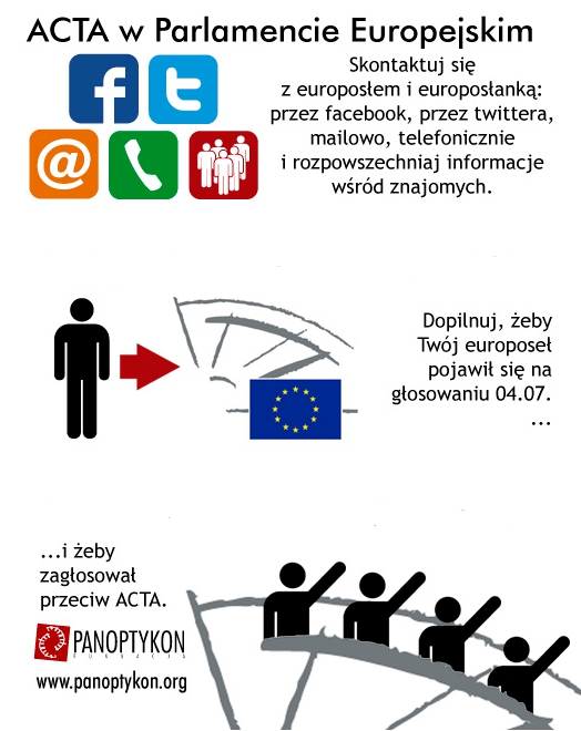 Artykuł 26.06.2012 4 min. czytania Tekst Zdajemy sobie sprawę, że być może macie już nas dosyć. Kolejny tydzień, kolejne wezwanie do działania. Ale obiecujemy, to już NAPRAWDĘ ostatni raz. Za nami pięć głosowań w komisjach i pięć wygranych przeciwników ACTA. Jesteśmy teraz na ostatniej prostej, przed nami już tylko decydująca rozgrywka w Strasburgu! W przyszłą środę (04.07) Parlament Europejski będzie rozstrzygał o "być albo nie być" kontrowersyjnego porozumienia. O wszystkich możliwościach jakie mają europosłowie możecie przeczytać w naszym artykule Gra o ACTA. Jak możecie pomóc? 1. Tradycyjnie, zachęcamy Was do pisania maili i dzwonienia do europosłów! Tym razem potrzebne jest precyzyjne działanie. Nie ma sensu wysyłać tego samego maila do 600 eurodeputowanych. Poniżej publikujemy ważne wskazówki taktyczne. 2. Co jeszcze można zrobić? Ponieważ czasu jest nieco więcej, polecamy również aktywność na ich społecznościowych profilach - większość parlamentarzystów można spotkać na Facebooku i Twitterze. 3. Wreszcie, namawiajcie swoich znajomych, by przyłączyli się do naszej akcji! Sami nie jesteśmy w stanie dotrzeć do wszystkich, dlatego potrzebna jest Wasza pomoc. A zatem... do dzieła! Ważne wskazówki taktyczne: 1. Nie wysyłajcie tego samego maila do wszystkich eurodeputowanych. W tym momencie trzeba przede wszystkim przekonywać nieprzekonanych! Poniżej udostępniamy przykładowe maile. 2. Co pisać / co mówić: - Po pierwsze, musimy uświadomić naszym reprezentantom, jak ważne dla obywateli jest to głosowanie: nie usprawiedliwiamy żadnych nieobecności! - Po drugie, trzeba wyjaśniać eurodeputowanym, że każdy głos oddany za przełożeniem głosowania na kolejny rok, każde wstrzymanie się od głosu i każda nieobecność będą przez nas zrozumiane, jako opowiedzenie się za ACTA! - Po trzecie, warto przypominać naszym reprezentantom, że kolejne wybory do Parlamentu Europejskiego już za 2 lata, a sprawa ACTA będzie testem na to, jak eurodeputowani myślą o Internecie. Warto, żeby mieli tego świadomość. Internet nie zapomina takich decyzji. Garść przydatnych informacji: Lista adresowa polskich posłów, których wciąż warto przekonywaćLista adresowa zagranicznych posłów, których wciąż warto przekonywaćPrzykład maila [wersja polska]Przykład maila [wersja angielska] Narzędzie opracowane przez La Quadrature du Net, dzięki któremu można dzwonić do posłów ZA DARMO! Fundacja Panoptykon Autor Linki i dokumenty acta.jpg99.09 KBjpeg plakat.jpg138.3 KBjpeg Temat Internet prawo prawo autorskie Poprzedni Następny Newsletter Otrzymuj informacje o działalności Fundacji Twoje dane przetwarza Fundacja Panoptykon w celu promowania działalności statutowej, analizy skuteczności podejmowanych działań i ewentualnej personalizacji komunikacji. Możesz zrezygnować z subskrypcji listy i zażądać usunięcia swojego adresu e-mail. Więcej informacji o tym, jak przetwarzamy twoje dane i jakie jeszcze prawa ci przysługują, w Polityce prywatności. Zapisz się Zapisz się Akceptuję Regulamin usługi Leave this field blank Zobacz także Artykuł Czas na brzydszą siostrę RODO Aktualizacja: 28.08 rząd przyjął projekt przepisów. 20.08.2018 Tekst Podcast Pornografia i dzieci. Co robić? Rozmowa z Łukaszem Wojtasikiem i Mikołajem Sowińskim Czy pornografia w sieci wyrządza więcej szkód niż ta w „świerszczyku”? Jaka część Internetu to strony pornograficzne? Czy kontakt mają z nimi już nawet przedszkolaki? Jak skutecznie rozwiązać problem dostępu dzieci do nieodpowiednich treści, i czy na pewno weryfikacja wieku użytkowników Internetu… 23.01.2020 Dźwięk Artykuł Fikcyjna reforma w służbach Czy Policja i służby specjalne wdrożyły RODO? Nie. Dlaczego? Bo mają – a w zasadzie powinny mieć – odrębne zasady. Regulacje dotyczące ochrony danych osobowych w sektorze bezpieczeństwa zawiera unijna dyrektywa policyjna. W polskim wydaniu będzie to tylko fikcja, a służby będą mogły więcej niż… 27.11.2018 Tekst