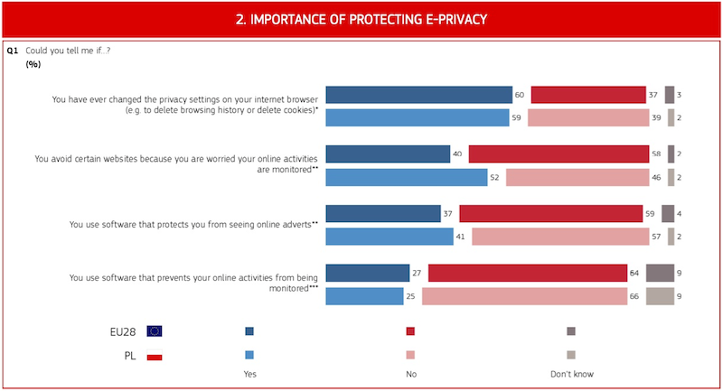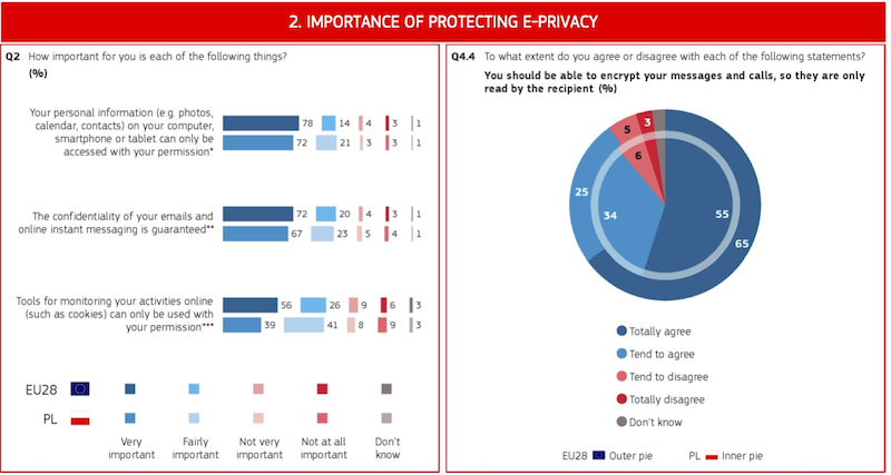 Artykuł 30.01.2017 1 min. czytania Tekst Image Prawie 93% Polek i Polaków uważa, że firmy powinny uzyskiwać dostęp do danych gromadzonych na ich smartfonie, komputerze czy tablecie tylko za ich zgodą. Takie wnioski wynikają z najnowszych badań Eurobarometru, który pytał Europejczyków o ochronę ich prywatności w sieci. Dla 90% naszych rodaków równie ważne jest zachowanie poufności maili czy informacji przekazywanych przez komunikatory. Polacy nie chcą też być śledzeni w sieci bez ich zgody – dla 80% badanych to bardzo ważna lub ważna kwestia. Eurobarometr pytał też o szyfrowanie komunikacji. 55% ankietowanych z Polski uważa, że każdy powinien mieć możliwość szyfrowania swoich maili czy połączeń telefonicznych. Ciekawie wyglądają informacje dotyczące korzystania z narzędzi zapewniających lepszą ochronę prywatności. 59% badanych zmieniało domyślne ustawienia prywatności w przeglądarkach internetowych, a 52% unika konkretnych stron internetowych ponieważ obawia się, że aktywność w sieci będzie śledzona. Dla porównania średnia europejska w tym wypadku wynosi 40%. Programy blokujące reklamy on-line są już mniej popularne – używa ich 41% badanych. Najmniejszą popularnością cieszą się zaś aplikacje zapobiegające monitorowaniu użytkowników w sieci – do korzystania z nich przyznaje się 25% badanych. Źródło: Flash Eurobarometr - E-privacy. Poland. 2016 Fundacja Panoptykon Autor Temat Internet dane osobowe Poprzedni Następny Newsletter Otrzymuj informacje o działalności Fundacji Twoje dane przetwarza Fundacja Panoptykon w celu promowania działalności statutowej, analizy skuteczności podejmowanych działań i ewentualnej personalizacji komunikacji. Możesz zrezygnować z subskrypcji listy i zażądać usunięcia swojego adresu e-mail. Więcej informacji o tym, jak przetwarzamy twoje dane i jakie jeszcze prawa ci przysługują, w Polityce prywatności. Zapisz się Zapisz się Akceptuję Regulamin usługi Leave this field blank Zobacz także Artykuł Odszkodowanie za wyciek 1500 zł odszkodowania za wyciek numeru PESEL i telefonu – przyznał Sąd Okręgowy w Warszawie kobiecie, która pozwała ubezpieczyciela – poinformował Dziennik Gazeta Prawna. To prawdopodobnie pierwsza sprawa, w której RODO egzekwował nie Urząd Ochrony Danych Osobowych, a sąd cywilny. 04.02.2021 Tekst Artykuł ePrivacy: apelujemy do Rady UE o silną ochronę prywatności Wspólnie z 24 europejskimi organizacjami i 13 przedstawicielami biznesu wysłaliśmy do Rady Unii Europejskiej list, w którym apelujemy o wysokie standardy ochrony prywatności użytkowników w rozporządzeniu ePrivacy. 03.12.2018 Tekst Artykuł Czy czeka nas cenzura Internetu? Do przodu posunęły się prace nad przepisami, które doprowadzą do filtrowania wszystkich obrazków, tekstów czy filmików udostępnianych przez nas w popularnych serwisach społecznościowych. O tym, czy nagranie z wykładu, internetowy mem albo zdjęcie z wakacji naruszają prawo autorskie, a tym… 05.06.2018 Tekst