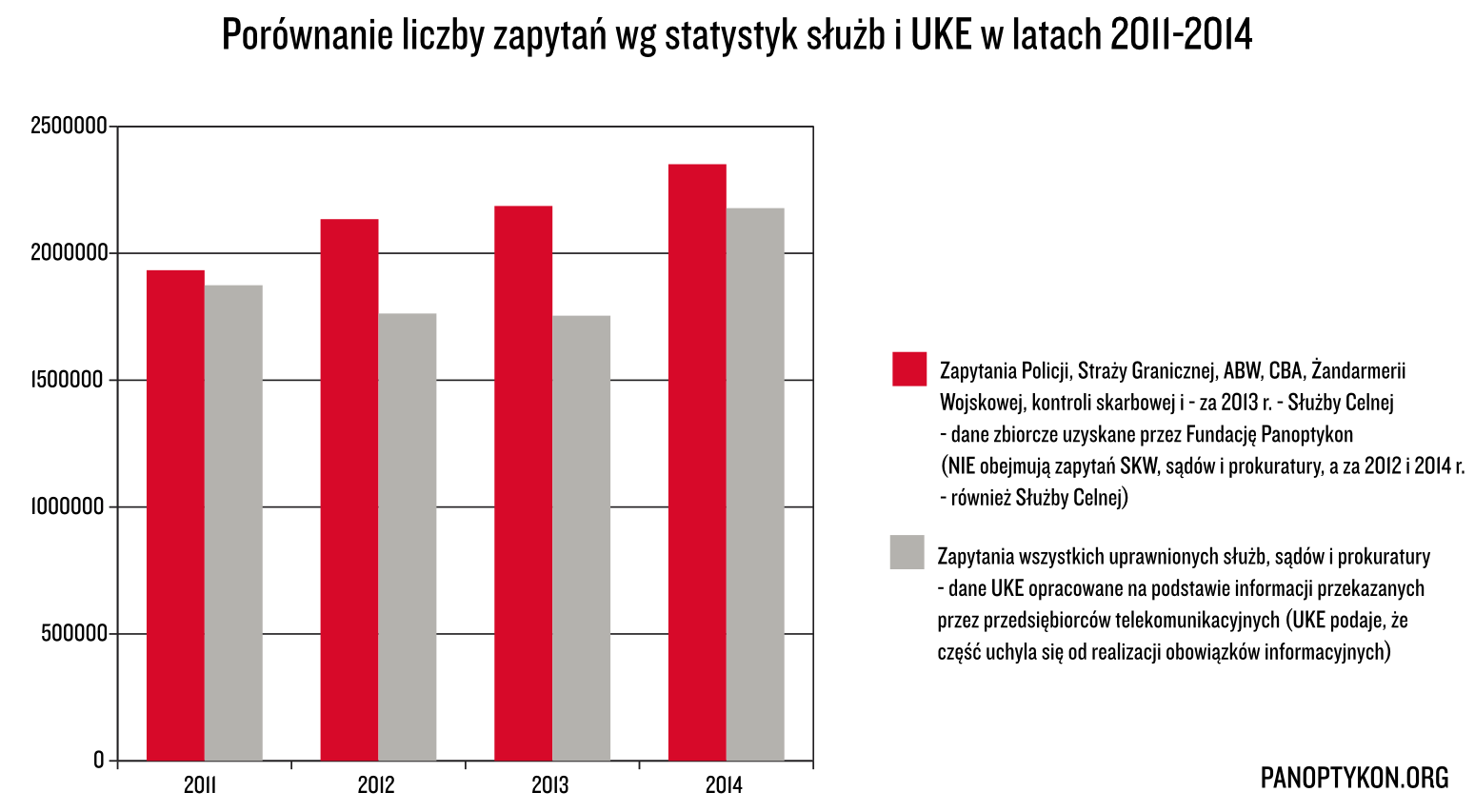 Statystyki dotyczące liczby zapytań służb o dane telekomunikacyjne co roku sprawiają niespodziankę. Od 2009 r. rosły od miliona do ponad dwóch, gdy nagle w 2012 r. Urząd Komunikacji Elektronicznej odnotował 5-procentowy spadek. Tej informacji nie potwierdziły jednak dane pozyskane przez Fundację Panoptykon bezpośrednio od służb, według których liczba zapytań wzrosła aż o 10%. W 2014 r. nastąpił powrót do poprzedniego trendu i – zarówno według UKE, jak i według służb – liczba zapytań wzrosła.