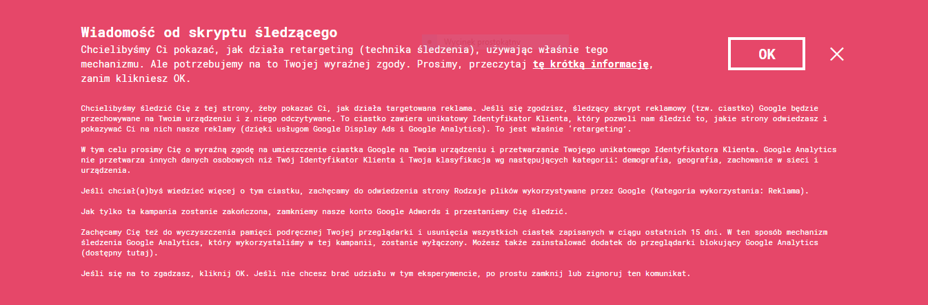 Artykuł 17.11.2017 5 min. czytania Tekst Image „(…) krwawią nam źrenice od tej ględźby obleśnej, od tej zachwalanki namolnej, że apartamenta, że koliby, że zbójnickie, że salceson po 6.50, że tam tylko po 5, że pajntbol i srajtpul, że gacie, że ogrodzenia, że jaskinia solna, że jama z gówna, że taki, śmaki, owaki, metr po metrze, płachta za płachtą, sztrajfa za sztrajfą, mamidło za mamidłem, baner taka jego mać w otchłań dostępności, w bezmiar oferty, w nieskończoność satysfakcji oraz spełnienia” – podsumowuje w felietonie dla „Tygodnika Powszechnego” uroki Zakopianki Andrzej Stasiuk. To realne, namacalne doświadczenie gwałtu, jaki reklama zadaje naszym zmysłom i szarym komórkom, jest dziś przeniesione żywcem do świata wirtualnego. Jednak to nie wizualna opresyjność reklamy jest w sieci najgorsza, ale to, co kryje się pod powierzchnią zalewającego nas badziewia. Niebezpiecznie zbliżamy się do momentu, kiedy otwarcie przeglądarki internetowej nie będzie różniło się zbytnio od wejścia na otoczony kamerami spacerniak. Każdy pośrednik w handlu internetową powierzchnią reklamową i każdy wydawca próbuje śledzić nasze ruchy w sieci, żeby z setek cyfrowych śladów ulepić profil, który po dobrej cenie wystawi na aukcji RTB. Jak żaba gotowana w letniej wodzie – w gąszczu mrugających pop-upów i ryczących filmików z autoplaya – powoli przyzwyczajamy się do ciastek i skryptów śledzących, traktując je jak zło konieczne lub cenę, którą musimy zapłacić za „darmowe” usługi. Ale Internet nie musi tak wyglądać. Przymuszanie użytkowników do płacenia własną prywatnością i intymnością za dostęp do treści (w dodatku treści coraz gorszej jakości) nie jest uczciwą transakcją. Żeby o tym przypomnieć, stworzyliśmy stronę „Dlaczego mnie śledzisz?/ Why Are You Tracking Me?”, na którą zapraszaliśmy Was w październiku. Czas wyjaśnić, skąd się wzięła. „Dlaczego mnie śledzisz” to jeden z elementów antyreklamowej kampanii edukacyjnej, którą stworzyliśmy wspólnie z holenderską organizacją Bits of Freedom i serbskim d:mode studio. Budżet reklamowy kampanii wynosił zaledwie tysiąc euro, które rozdzieliliśmy pomiędzy kilka krajów europejskich. To zmusiło nas do ogromnej precyzji na etapie planowania kampanii. Z pomocą przyszedł nam Google, który w narzędziach do tworzenia reklam udostępnia unikatowe dane na temat osób korzystających z wyszukiwarki. Wścibskość Google’a pozwoliła wyróżnić dwie główne grupy docelowe kampanii: internautów, którzy już wcześniej interesowali się tematyką prywatności w sieci, oraz osoby, które szukały porad dotyczących trudnych, intymnych tematów (m.in. depresji wśród nastolatków, zaburzeń erekcji, wczesnej ciąży). Tym razem zamiast usługi proponującej rozwiązanie problemu zobaczyli bannery, które bez owijania w bawełnę ujawniały, co i skąd o nich wiedzą, oraz zachęcały do sprzeciwu. W ten sposób reklamowy gigant nieświadomie przyczynił się do ujawnienia głębokości śledzenia i inwazyjności praktyk reklamowych. Na tych, którzy zareagowali na banery (anty)reklamowe albo inną drogą trafili na stronę docelową kampanii, czekała jeszcze jedna niespodzianka: wiadomość od skryptu śledzącego. Szczegółowa klauzula informacyjna wyjaśniała – w prostych słowach, ale bez uproszczeń – jakie informacje są zbierane na potrzeby kampanii, jak działa tzw. retargeting (dalsze śledzenie na potrzeby reklamowe po opuszczeniu strony internetowej) i jak można samodzielnie zablokować mechanizm śledzący. Dane, które uzyskaliśmy z Piwika, mniej śledzącego otwartego odpowiednika Google Analytics, pozwalają nam mieć nadzieję, że wielu z Was się z nią zapoznało (średnia długość wizyty na stronie wynosiła około minuty). Ostatnie euro z budżetu zostało wydane na kilka godzin przed decydującymi głosowaniami w Brukseli. Jeszcze podczas trwania kampanii (19.10) Komisja Wolności Obywatelskich, Sprawiedliwości i Spraw Wewnętrznych (LIBE) przegłosowała serię korzystnych poprawek, dzięki którym – między innymi – wyszukiwarki i inne strony internetowe nie będą nas mogły bezkarnie śledzić bez naszej wiedzy i zgody, a nasze urządzenia końcowe (np. smartfony) i zainstalowane na nich aplikacje będą musiały gwarantować maksymalny poziom ochrony danych w ustawieniach domyślnych (privacy by default). Kilka dni później (26.10) w głosowaniu plenarnym Parlamentu Europejskiego Komisja LIBE utrzymała swój mandat i obroniła korzystny dla praw użytkowników projekt rozporządzenia, a zatem będzie reprezentować Parlament w dalszych negocjacjach z Komisją Europejską oraz Radą Unii Europejskiej. Stanowisko samej Rady nie zostało jeszcze wypracowane, ale z daleka widać, że nad rozporządzeniem ePrivacy zbierają się czarne chmury. Niektóre państwa członkowskie – w tym Polska – zajęły otwarcie krytyczne stanowisko wobec projektu i są gotowe blokować polityczne porozumienie. Inne chętnie wykorzystają tę okazję, żeby wprowadzić niekorzystne dla użytkowników i usługodawców rozwiązania, takie jak obowiązkowa retencja danych internetowych na potrzeby walki z przestępczością. Chcielibyśmy móc powiedzieć, że to ostatnia taka kampania w naszym wykonaniu. Niestety, musimy być gotowi na kolejną rundę ciężkich walk o e-prywatność. Firmy z branży interaktywnej wcale nie mają ochoty rezygnować z darmowych danych. Jak informowaliśmy, przed kluczowymi głosowaniami w Brukseli w sieci pojawiło się wiele nieprawdziwych informacji o możliwych konsekwencjach rozporządzenia ePrivacy, a część z nich zaczęli powtarzać sami europosłowie. Dlatego tak ważne jest, żeby poza głosem lobbystów politycy mieli szansę usłyszeć głos zwykłych ludzi, normalnych użytkowników usług internetowych. To również był cel naszej kampan