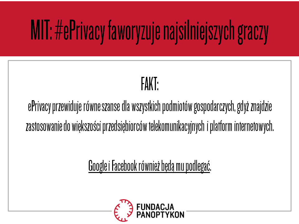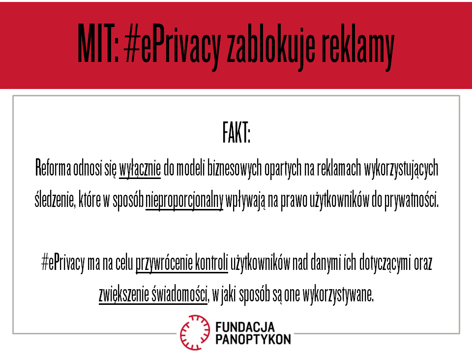 Artykuł 25.10.2017 4 min. czytania Tekst Image Już jutro w Parlamencie Europejskim odbędzie się głosowanie w sprawie mandatu LIBE do reprezentowania parlamentu w negocjacjach dotyczących rozporządzenia ePrivacy. Dziś obalamy mity, które korporacyjne lobby wykorzystuje przeciwko e-prywatności. Nadal zachęcamy Was do kontaktu z europosłami! Mit: ePrivacy zablokuje reklamy Fakt: Rozporządzenie ePrivacy nie blokuje żadnych modeli biznesowych, również tych finansowanych za pomocą reklam. Reforma odnosi się wyłącznie do modeli biznesowych opartych na reklamach wykorzystujących śledzenie, które w sposób nieproporcjonalny wpływają na prawo użytkowników do prywatności. Rozporządzenie ma na celu przywrócenie kontroli użytkowników nad danymi ich dotyczącymi oraz zwiększenie świadomości użytkowników na temat tego, jak informacje o nich są wykorzystywane. Mit: ePrivacy jest złe dla demokracji Fakt: Reklamy oparte na śledzeniu są podstawą modele biznesowych wykorzystywanych przez twórców fake newsów. Według New York Timesa, autor jednego ze słynnych fake newsów, które pomogły Donaldowi Trumpowi wygrać wybory, zarobił 22 tys. dolarów dzięki reklamom Google’a wyświetlanym na jego stronie. Inny przykład – podczas śledztwa prowadzonego przez amerykańską senacką komisję wywiadu prawnicy Facebooka złożyli zeznania w związku z wykorzystaniem serwisu do promocji ok. 3000 reklam rozpowszechniających fake newsy podczas wyborów prezydenckich w USA. Kiedy użytkownicy są śledzeni przez reklamodawców, zagrożona jest nie tylko ich prywatność, ale pojawia się dodatkowo wysokie ryzyko wykorzystania informacji do wywierania wpływu na polityczne przekonania użytkowników. Mit: ePrivacy jest złe dla pluralizmu mediów i jakości dziennikarstwa Fakt: Reklamy oparte na śledzeniu generują przychody poprzez uzyskanie jak największej liczby kliknięć (odwiedzin). Oznacza to, że – jak ujmuje to brytyjski The Guardian – „nędzna treść” wygrywa z jakością. Szukanie sensacji i oburzenia jest bardziej dochodowe niż rzetelne dziennikarstwo. Czerpanie przez wydawców zysków z reklam opartych na śledzeniu stanowi zagrożenie dla prywatności użytkowników oraz wyraźnie pogarsza jakość dziennikarstwa. Mit: ePrivacy sprzyja Google’owi i Facebookowi Fakt: Część lobby wydawniczego twierdzi, że ePrivacy przyniesie korzyści jedynie Google’owi i Facebookowi. W rzeczywistości to aktualne braki w regulacjach spowodowały sytuację, w której Google i Facebook sprawują duopol jeśli chodzi o zyski z reklam. Badania wskazują, że w USA Google i Facebook posiadają około 2/3 rynku reklam i są odpowiedzialne za ok. 99% wzrostu dochodów na rynku. Silne rozporządzenie ePrivacy rozwiąże problem istniejących braków regulacyjnych i wzmocni konkurencję na rynku reklam. Rozporządzenie ePrivacy jest spójne z postanowieniami ogólnego rozporządzenia o ochronie danych (RODO), które redukują regulacyjne obciążenia. ePrivacy wprowadza postanowienia o domyślnych ustawieniach prywatności (privacy by default), które przyczynią się do kontynuacji rozwoju sprzyjającego prywatności europejskiego przemysłu. Mit: ePrivacy faworyzuje najsilniejszych graczy Fakt: Produkty Google’a i Facebooka dominują na unijnym rynku dostawców usług poczty elektronicznej, wyszukiwarek i mediów społecznościowych, koncentrując masę prywatnych informacji o obywatelach UE w rękach tych dwóch firm. Nie jest zaskakujące, że podmioty reprezentujące te firmy aktywnie apelują o zniesienie obecnie obowiązującego prawa i/lub odrzucenie reform. Mimo twierdzeń, że rozporządzenie ePrivacy zabije Internet i platformy, reforma przewiduje równe szanse dla wszystkich podmiotów gospodarczych i pewność prawa zarówno dla biznesu, jak i dla użytkowników, dzięki temu, że rozporządzenie znajdzie zastosowanie do większości przedsiębiorców telekomunikacyjnych i platform internetowych. Co możesz zrobić przed jutrzejszym głosowaniem? Zadzwoń do europosłów korzystając z darmowego internetowego telefonu stworzonego przez La Quadrature du Net. Zaczep europosłów na Twitterze: lista kont polskich europosłów. Wyślij maila, np. podobnego do tego, który my wysłaliśmy dziś do polskich europosłów. Więcej informacji: Chcesz ochrony prywatności w sieci? Zadzwoń do europosłów! Zawalcz o swoją prywatność w sieci! Polityczne gry wokół e-prywatności: jaka regulacja jest możliwa i kto o tym zdecyduje? Śledzenie i profilowanie w sieci. W czym problem? Co się zmieni w prawie? Jak może wyglądać przyszłość? [PDF] EDRi: Mythbusting. Killing the lobby myths that are polluting the preparation of the ePrivacy regulation [PDF] Fundacja Panoptykon Autor Temat biznes reklamowy profilowanie Internet reforma ochrony danych Poprzedni Następny Newsletter Otrzymuj informacje o działalności Fundacji Twoje dane przetwarza Fundacja Panoptykon w celu promowania działalności statutowej, analizy skuteczności podejmowanych działań i ewentualnej personalizacji komunikacji. Możesz zrezygnować z subskrypcji listy i zażądać usunięcia swojego adresu e-mail. Więcej informacji o tym, jak przetwarzamy twoje dane i jakie jeszcze prawa ci przysługują, w Polityce prywatności. Zapisz się Zapisz się Akceptuję Regulamin usługi Leave this field blank Zobacz także Artykuł Google, Apple, Facebook i Amazon w pandemii zbierają żniwa Nadchodzące miesiące wypełni nie tylko walka na froncie epidemicznym, ale też regulacyjnym. O kontrolę nad algorytmicznymi systemami, które w coraz większym stopniu zarządzają naszą zbiorową świadomością. 28.04.2020 Tekst Artykuł Po konsultacjach nowej ustawy o ochronie danych: podsumowujemy zdobycze i straty Ministerstwo Cyfryzacji opublikowało nową wersję ustawy o ochronie danych osobowych, będącej wdrożeniem RODO. Prowadzone przez kilka miesięcy konsultacje publiczne nie poszły
