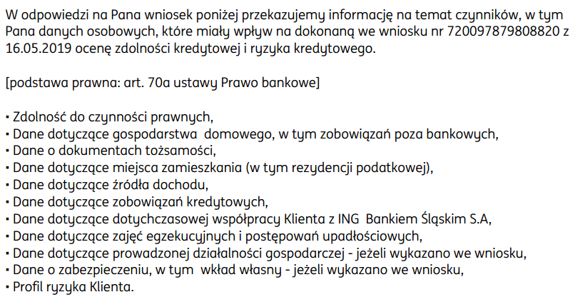 W odpowiedzi na wniosek o czynniki, w tym dane osobowe, które miały wpływ na ocenę zdolności kredytowej, ING wysłało autorowi tekstu poniższą informację: