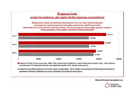 W Polsce dostęp do tych kategorii danych nie podlega żadnej zewnętrznej kontroli: policja i inne służby (Straż Graniczna, Agencja Bezpieczeństwa Wewnętrznego, Centralne Biuro Antykorupcyjne, Żandarmeria Wojskowa, kontrola skarbowa, służba celna i Służba Kontrwywiadu Wojskowego) przed sięgnięciem po dane nie muszą pytać nikogo o zgodę. Nawet, jeśli służby zbierają dane o konkretnej osobie – sprawdzają jej położenie czy listę kontaktów – mogą skorzystać ze specjalnego interfejsu, który umożliwia im bezpośredni dostęp do danych. Taka możliwość istnieje nie tylko w poważnych sprawach (np. rozpracowywania siatek przestępczych), ale również w przypadku podejrzeń o błahe występki. Brak wiarygodnych danych na temat skali tego zjawiska tylko pogłębia problem.
