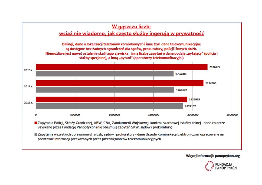Co roku operatorzy telekomunikacyjni przekazują UKE informacje o ilości zapytań o dane telekomunikacyjne, jakie otrzymali od sądów, prokuratorów, policji i innych służb. W 2011 r. było to 1,87 mln, w 2012 r. – 1,76 mln, a w minionym roku – 1,75 mln zapytań, ponad 100 tys. mniej niż dwa lata wcześniej. Czy zatem zainteresowanie naszymi danymi spada? Informacje zebrane przez Fundację Panoptykon od policji i większości służb tej tendencji nie potwierdzają – służby drugi rok z rzędu „przyznają” się do ponad 2 mln zapytań.
