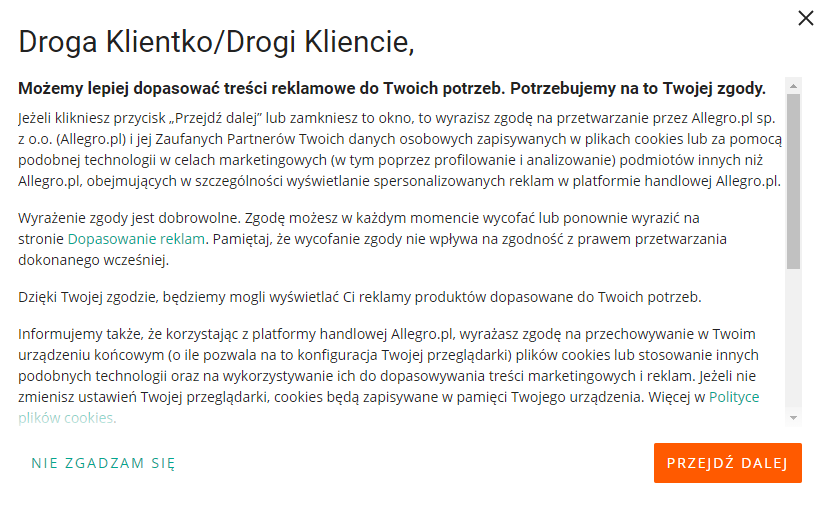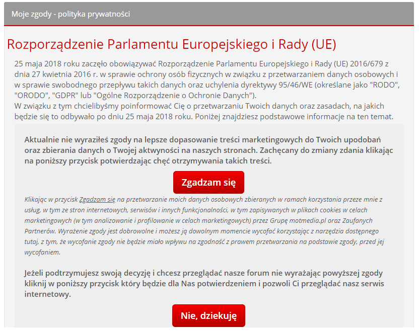 Poradnik 13.06.2018 3 min. czytania Tekst Na czym polega ta praktyka? Nie sposób jej pomylić z żadną ze złych praktyk związanych z pozyskiwaniem zgody, które opisujemy w ramach naszego przeglądu. Modelowa klauzula zgody jest prosta jak drut i nie stwarza użytkownikowi żadnych trudności. Sprowadza się do pytania: „Czy zgadzasz się na przetwarzanie Twoich danych osobowych…?” (tu powinien pojawić się cel, w jakim Twoje dane będą wykorzystywane, i inne ważne komunikaty albo informacja, gdzie możesz je znaleźć). Po nim jest już tylko miejsce na odpowiedź w formie prostej alternatywy „tak/nie”. Jeśli klikniesz „nie”, okienko znika i wszystko działa normalnie. Przykłady: ForumSamochodowe.pl (Sprawdzamy mechanizm działania plików cookies na stronie). Allegro.pl (Podoba nam się wyraźny guzik „nie zgadzam się”, ale Allegro mogłoby zrezygnować ze zgody poprzez zamknięcie okienka). Politico.com Deciem: jasna informacja o celach poszczególnych plików cookie i brak zaznaczenia domyślnie tych, których instalacja nie jest niezbędna do skorzystania ze strony Jak to się ma do RODO? Klauzula zgody, która daje prostą alternatywę (tak/nie) i wszystkie potrzebne informacje na temat przetwarzania danych, a jednocześnie opiera się na świadomym wyborze użytkownika (nie stawia go pod presją), w pełni realizuje wymagania RODO. Mówiąc najprościej: chodzi o to, żebyśmy zgadzali się na przetwarzanie danych świadomie (rozumieli, z czym to się wiąże; mieli szansę zastanowić się, czy naprawdę tego chcemy) i nie działali automatycznie. Co możesz zrobić? Docenić! Jeśli ucieszyło Cię to, że wreszcie ktoś potraktował Twoją autonomię informacyjną poważnie i dał Ci prawo wyboru (bez żadnych sztuczek, dwuznaczności i nacisków), warto odwdzięczyć się pozytywną informacją zwrotną. Zachęcamy do chwalenia takich dobrych praktyk w mediach społecznościowych i podsyłanie ich bezpośrednio Fundacji Panoptykon. Zobacz inne praktyki: RODO na tacy. Sezon II: Subiektywny przegląd (złych i dobrych) praktyk. Wspieraj naszą walkę o lepsze prawo ochrony danych! Wpłać darowiznę na konto Fundacji Panoptykon. Katarzyna Szymielewicz Autorka Temat reforma ochrony danych Poprzedni Następny Newsletter Otrzymuj informacje o działalności Fundacji Twoje dane przetwarza Fundacja Panoptykon w celu promowania działalności statutowej, analizy skuteczności podejmowanych działań i ewentualnej personalizacji komunikacji. Możesz zrezygnować z subskrypcji listy i zażądać usunięcia swojego adresu e-mail. Więcej informacji o tym, jak przetwarzamy twoje dane i jakie jeszcze prawa ci przysługują, w Polityce prywatności. Zapisz się Zapisz się Akceptuję Regulamin usługi Leave this field blank Zobacz także Poradnik RODO na tacy, czyli jak możemy skorzystać na nowych przepisach W ostatnich miesiącach media coraz częściej mówią o rozporządzeniu o ochronie danych osobowych (RODO), które zacznie być stosowane od maja tego roku. Największe poruszenie wywołują kary, które grożą firmom, jeżeli te nie poradzą sobie z wdrożeniem nowych przepisów, i procedury, jakie w związku z… 31.01.2018 Tekst Poradnik Poradnik BINGO 13. RODO w organizacji Ochrona danych nie należała do tej pory do najbardziej zadbanych obszarów w organizacjach społecznych. Zamieszanie wokół RODO sporo zmieniło, jeśli chodzi o świadomość, ale już nie tak wiele, jeśli chodzi o praktyki: wszyscy wiedzą, że jest RODO, ale nie oznacza to bynajmniej, że go przestrzegają.… 01.02.2019 Tekst Artykuł RODO w liczbach: co przyniosło nam pierwsze pięć miesięcy? Statystyki zebrane z ośmiu państw Unii Europejskiej na potrzeby pierwszego numeru „GDPR Today” pokazują, że – zaledwie pięć miesięcy po rozpoczęciu stosowania RODO – nowe prawo żyje i ma się świetnie. Urzędy ochrony danych otrzymały tysiące skarg i informacji o naruszeniach, nałożone też zostały… 26.10.2018 Tekst