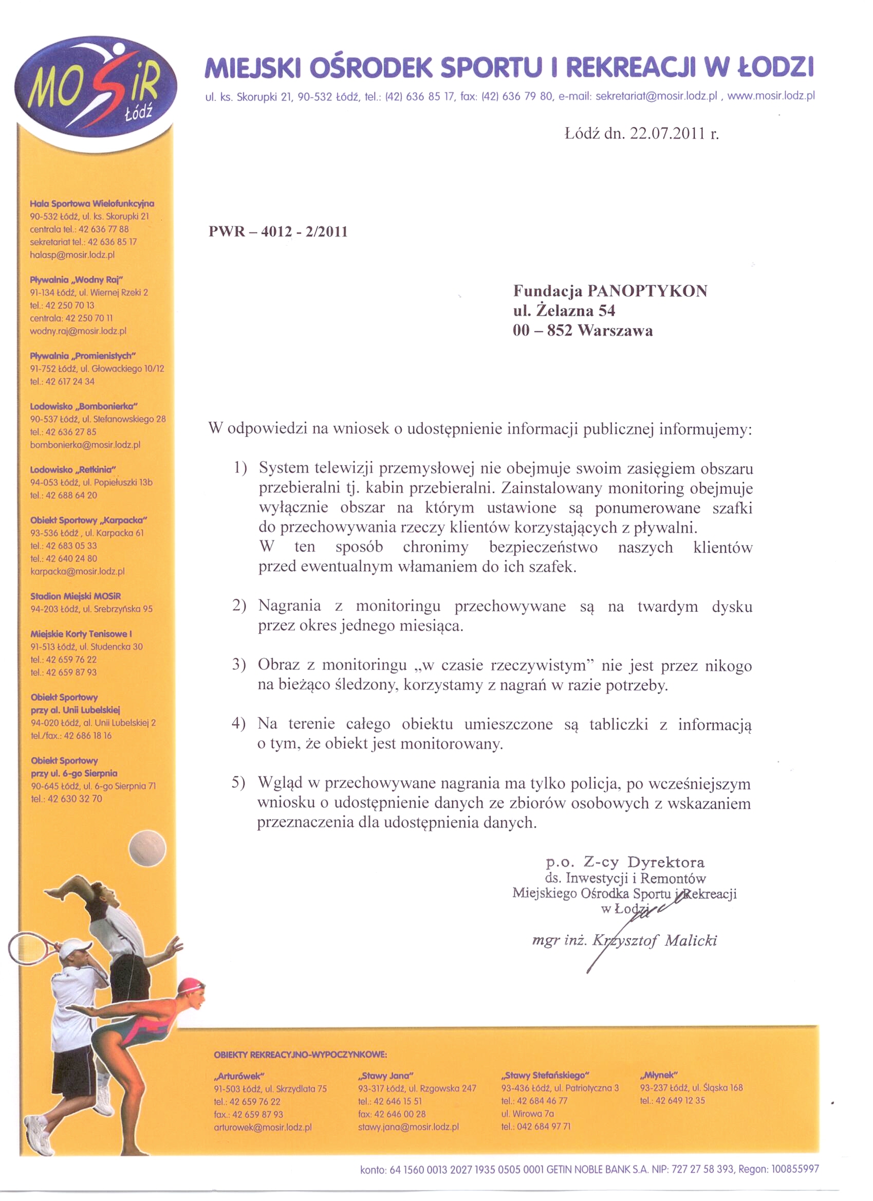 Artykuł 21.07.2011 3 min. czytania Tekst Image 21 lipca 2011 r. wystąpiliśmy z pismem interwencyjnym do Dyrektora Miejskiego Ośrodka Sportu i Rekreacji w Łodzi, po tym, jak dowiedzieliśmy się, że na pływalni, która jest jednym z obiektów MOSiR, zainstalowano kamerę monitoringu wizyjnego, bezpośrednio nad boksami przebieralni. Jak wielokrotnie pisaliśmy, problematyka dopuszczalności stosowania wideonadzoru w przestrzeni publicznej nie doczekała się jeszcze szczegółowej regulacji prawnej. Dlatego w naszym piśmie, zwracamy uwagę, że legalność monitoringu w każdym przypadku powinna być oceniana przede wszystkim przez pryzmat zasady celowości oraz proporcjonalności. „Należy pamiętać, że rejestracja wizerunku osoby za pomocą telewizji przemysłowej jest jednocześnie objęta zakresem art. 47 Konstytucji Rzeczypospolitej Polskiej oraz art. 8 Europejskiej Konwencji Praw Człowieka, które statuują prawo do poszanowania życia prywatnego jednostki. W dodatku, nagrania z monitoringu mogą zawierać dane osobowe i w związku z tym ich rejestracja, przechowywanie, czy ujawnianie podlega ścisłym rygorom wynikającym z ustawy o ochronie danych osobowych. (...) O ile monitorowanie holu, przestrzeni, w której znajdują się szafki, parkingu wokół budynku można wytłumaczyć względami ochrony mienia osób korzystających z pływalni, trudno jednak znaleźć uzasadnienie dla wideonadzoru przebieralni i innych miejsc intymnych. Przebieralnie, obok obiektów sanitarnych, są zresztą najczęściej podawanym przykładem miejsca, w którym monitoring co do zasady jest niezgodny z prawem” - piszemy w liście do Dyrektora. W związku z zaistniałą sytuacją, zwróciliśmy się także do Dyrektora MOSiR z wnioskiem o udostępnienie informacji publicznej, w którym poprosiliśmy o: wskazanie uprawnionego celu, uzasadniającego instalację systemu telewizji przemysłowej o zasięgu obejmującym obszar przebieralni, przekazanie informacji o tym, w jaki sposób oraz przez jaki okres zarejestrowane na terenie pływalni materiały są przechowywane, a także kto jest podmiotem uprawnionym do dostępu do obrazu z monitoringu w czasie rzeczywistym oraz odpowiedzialny za bezpieczeństwo gromadzonych nagrań, wskazanie, w jaki sposób administrator monitoringu wywiązuje się z obowiązków informacyjnych względem użytkowników pływalni oraz czy istnieją procedury wglądu do przechowywanych nagrań, przez osoby których wizerunek został na nich zarejestrowany. Przeczytaj całe pismo i wniosek. AKTUALIZACJA: odpowiedź łódzkiego MOSiR na naszą interwencję. adamczyk Autor Linki i dokumenty kamera_wodny_raj_m.jpg33.3 KBjpeg kamera_wodny_raj_d.jpg104.39 KBjpeg pismo_mosir_20-07-2011.pdf1.75 MBpdf wniosek_info_publ_mosir_20_07_2011.pdf643.18 KBpdf odpowiedz_mosir.jpg816.43 KBjpeg Temat monitoring wizyjny Poprzedni Następny Newsletter Otrzymuj informacje o działalności Fundacji Twoje dane przetwarza Fundacja Panoptykon w celu promowania działalności statutowej, analizy skuteczności podejmowanych działań i ewentualnej personalizacji komunikacji. Możesz zrezygnować z subskrypcji listy i zażądać usunięcia swojego adresu e-mail. Więcej informacji o tym, jak przetwarzamy twoje dane i jakie jeszcze prawa ci przysługują, w Polityce prywatności. Zapisz się Zapisz się Akceptuję Regulamin usługi Leave this field blank Zobacz także Artykuł Kamery w szkołach – szansa na porządki Ministerstwo Cyfryzacji wspólnie z Ministerstwem Edukacji Narodowej przygotowało projekt regulacji funkcjonowania kamer w szkołach. Urządzeń od tego nie ubędzie, ale przynajmniej skończy się monitoringowa wolna amerykanka. Napisaliśmy do ministerstw o tym, co myślimy o proponowanej regulacji:… 04.05.2018 Tekst Artykuł Odzyskaj swoją twarz! Poprzyj kampanię przeciwko masowej inwigilacji biometrycznej Technologie, takie jak biometryczne rozpoznawanie twarzy, pozbawiają nas podstawowych praw: prywatności rozmowy z przyjaciółmi i rodziną, wolności demonstrowania w obronie planety i praw kobiet, aktywności społecznej i politycznej, odwiedzenia kościoła czy spotkania związku zawodowego bez wiedzy… 13.11.2020 Tekst Artykuł Kamery w szkołach W ramach prac legislacyjnych nad wprowadzeniem RODO rząd zaproponował w prawie oświatowy 04.04.2018 Tekst