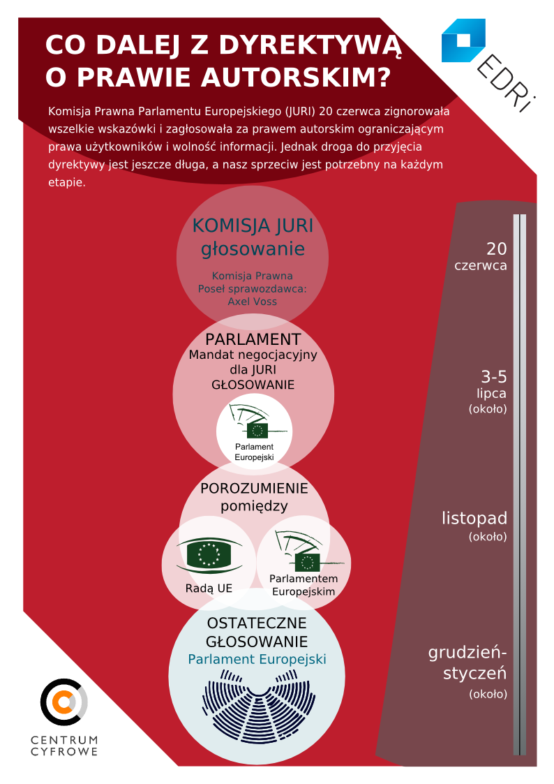 Artykuł 03.07.2018 2 min. czytania Tekst Image [AKTUALIZACJA] Udało się! Większością 318 do 278 (przy 31 głosach wstrzymujących) Paralament Europejski odrzucił mandat JURI do negocjacji w imieniu Parlamentu tekstu dyrektywy o prawie autorskim. Tym samym o przyszłości Internetu rozmawiać będą we wrześniu na posiedzieniu plenarnym wszyscy europosłowie i wszystkie europosłanki. Cieszymy się, że Parlament postawił na otwartą i demokratyczną debatę. Dziękujemy za Wasze zaangażowanie! O postępach prac nad dyrektywą będziemy Was informować we wrześniu. Już w czwartek w Parlamencie Europejskim odbędzie się głosowanie w sprawie dyrektywy o prawie autorskim, która m.in. wprowadza obowiązek filtrowania internetowych treści zamieszczanych przez użytkowników. Europosłowie zdecydują, czy wersja wypracowana przez Komisję Prawną (JURI) zostanie przyjęta jako oficjalne stanowisko Parlamentu w trójstronnych negocjacjach z Radą i Komisją. Jeśli europosłowie postanowią nie przyznać Komisji JURI mandatu negocjacyjnego, debata o ostatecznym kształcie dyrektywy będzie musiała się odbyć na posiedzeniu plenarnym Parlamentu. Naszym zdaniem kwestia jest na tyle ważna, a zarazem kontrowersyjna, że wymaga uwagi całego Parlamentu Europejskiego i głosowania na posiedzeniu plenarnym. Dlatego wraz z innymi organizacjami pozarządowymi apelujemy do polskich europosłów o głosowanie przeciwko przyznaniu Komisji JURI mandatu do negocjacji. Czy nowa dyrektywa to „ACTA 2”, a może potrzebna reforma? Jak to zwykle bywa, prawda leży pośrodku. Zainteresowanym gorąco polecamy materiały i analizy Centrum Cyfrowego: Artykuł 13 – diabeł tkwi w szczegółach Artykuł 13 – objaśniamy List otwarty do polskich europosłów w sprawie europejskiej reformy prawa autorskiego [PDF, 52 KB] Fundacja Panoptykon Autor Temat Internet prawo autorskie Poprzedni Następny Newsletter Otrzymuj informacje o działalności Fundacji Twoje dane przetwarza Fundacja Panoptykon w celu promowania działalności statutowej, analizy skuteczności podejmowanych działań i ewentualnej personalizacji komunikacji. Możesz zrezygnować z subskrypcji listy i zażądać usunięcia swojego adresu e-mail. Więcej informacji o tym, jak przetwarzamy twoje dane i jakie jeszcze prawa ci przysługują, w Polityce prywatności. Zapisz się Zapisz się Akceptuję Regulamin usługi Leave this field blank Zobacz także Artykuł ePrivacy: apelujemy do Rady UE o silną ochronę prywatności Wspólnie z 24 europejskimi organizacjami i 13 przedstawicielami biznesu wysłaliśmy do Rady Unii Europejskiej list, w którym apelujemy o wysokie standardy ochrony prywatności użytkowników w rozporządzeniu ePrivacy. 03.12.2018 Tekst Artykuł Parlament Europejski zagłosował za artykułem 13 Europarlament większością 348 do 247 przegłosował zagrażający wolności słowa projekt dyrektywy o prawie autorskim, którego artykuł 13 zmusi platformy internetowe do filtrowanie Internetu. Europosłowie nie uwzględnili apeli wielu naukowców, organizacji społecznych i 5 mln użytkowników, którzy w… 27.03.2019 Tekst Artykuł Branża interaktywna konsultuje Internet. I potwierdza własne tezy Czy wiecie, że 41% internautów „zna szczegóły” RODO, a ponad połowa słyszała o RODO jeszcze przed jego wdrożeniem? Tak wysoka samoocena kompetencji polskich internatów zbiła nas nieco z pantałyku, bo znajomość rozporządzenia nawet wśród prawników nie jest powszechna (ostatecznie mówimy o 99… 05.12.2018 Tekst