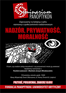 Artykuł 13.04.2011 1 min. czytania Tekst Image Serdecznie zapraszamy na kolejną rozmowę o społeczeństwie nadzorowanym: NADZÓR, PRYWATNOŚĆ, MORALNOŚĆ Rozmowa o kwestiach fundamentalnych Na najbliższym seminarium chcemy wspólnie zastanowić się nad związkami między tymi trzema pojęciami. Zapytać o to, czy nadzór zabija moralność i czy prywatność może ją uratować... Będziemy dyskutować o tym: * Czy współczesny człowiek w ogóle potrzebuje prywatności? * Czy prywatność, tak jak autonomia woli, jest warunkiem moralności? * W jaki sposób poczucie "życia pod nadzorem" wpływa na nasze wartości? Czy człowiek poddany totalnemu nadzorowi nie ma już dylematów moralnych? * Czym się różni nadzór wspólnoty od nadzoru państwa lub korporacji (z punktu widzenia jednostki, jej świata, ale także całego społeczeństwa)? Naszymi gośćmi będą: Paweł Łuków - profesor filozofii, adiunkt w Zakładzie Etyki Instytutu Filozofii Uniwersytetu Warszawskiego, znawca problematyki etycznej (w tym współczesnych etyk kantowskich). Marek Jerzy Minakowski - doktor nauk humanistycznych. Główne pola jego zainteresowań badawczych to pogranicze klasycznej humanistyki (historia starożytna, filologia klasyczna, nauki pomocnicze historii) z informatyką i logiką matematyczną. Przedsiębiorca, twórca "serwisów genealogicznych". Zapraszamy 19 kwietnia, we wtorek, o godz. 19.00. Jak zwykle spotykamy się w Nowym Wspaniałym Świecie (Warszawa, ul. Nowy Świat 63, I piętro). Małgorzata Szumańska Autorka Linki i dokumenty SEM-PAN_nadzor-prywatnosc-moralnosc_m.png46.11 KBpng SEM-PAN_nadzor-prywatnosc-moralnosc.jpg379.62 KBjpeg Poprzedni Następny Newsletter Otrzymuj informacje o działalności Fundacji Twoje dane przetwarza Fundacja Panoptykon w celu promowania działalności statutowej, analizy skuteczności podejmowanych działań i ewentualnej personalizacji komunikacji. Możesz zrezygnować z subskrypcji listy i zażądać usunięcia swojego adresu e-mail. Więcej informacji o tym, jak przetwarzamy twoje dane i jakie jeszcze prawa ci przysługują, w Polityce prywatności. Zapisz się Zapisz się Akceptuję Regulamin usługi Leave this field blank Zobacz także Artykuł TERREG, czyli Europa zwalcza treści terrorystyczne w sieci Rozporządzenie TERREG, regulujące postępowanie zw treściami o charakterze terrorystycznym w sieci, zostało ostatecznie przyjęte przez Parlament Europejski. Niestety Unia wylała dziecko z kąpielą. TERREG pozwoli organom odpowiedzialnym za walkę z terroryzmem – jak polska Agencja Bezpieczeństwa… 30.04.2021 Tekst Artykuł EDPS, PE i OBWE apelują o ograniczenia dla reklamy śledzącej „Przetwarzanie danych najbardziej wrażliwych grup, np. dzieci, może mieć nieprzewidywalne skutki dla całego pokolenia” – pisze Europejski Inspektor Ochrony Danych Wojciech Wiewiórowski i domaga się wprowadzenia do aktu o usługach cyfrowych (DSA) ograniczeń dla śledzącej reklamy. 21.03.2022 Tekst Artykuł Prywatność Europejczyków znów pod ostrzałem Kongresu Choć waszyngtoński Kapitol jest od Polski oddalony o ponad 7000 km, to tworzone przez amerykański parlament prawa bardzo często mogą wpływać bezpośrednio na naszą sytuację. Mowa nie tylko o regulacjach dotyczących internetowych gigantów, takich jak Facebook czy Google, z których usług korzystamy w… 20.03.2018 Tekst