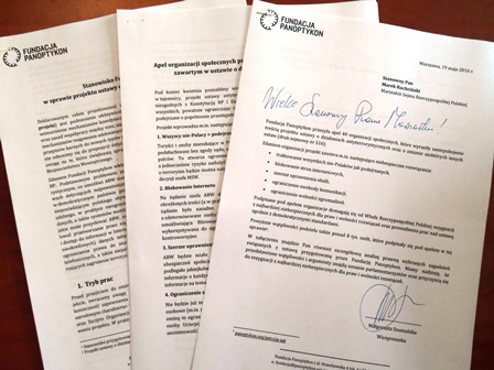 Artykuł 19.05.2016 3 min. czytania Tekst Image Przesłaliśmy dziś na ręce Marszałka Sejmu apel 40 organizacji społecznych i ponad 8 tysięcy obywateli, którzy wyrazili zaniepokojenie treścią projektu ustawy o działaniach antyterrorystycznych. Dziś właśnie Sejm rozpoczął prace nad tym projektem. W apelu domagamy się rezygnacji z najbardziej niebezpiecznych rozwiązań zawartych w projekcie, jak np. blokowania stron internetowych czy możliwości prowadzenia kontroli operacyjnej (np. podsłuchy) wobec cudzoziemców bez zgody sądu. Oczekujemy też, że posłowie podejmą decyzję o zorganizowaniu w sprawie projektu wysłuchania publicznego. Poza apelem przekazaliśmy też Marszałkowi Sejmu szczegółową opinię do projektu, w której krytykujemy zarówno pospieszny tryb prac, z pominięciem konsultacji publicznych, jak i szereg niezgodnych z Konstytucją RP ograniczeń praw i wolności. Projekt zwiększa uprawnienia Agencji Bezpieczeństwa Wewnętrznego (np. w zakresie dostępu do danych przechowywanych w rejestrach publicznych takich jak NFZ), nie wprowadzając jednocześnie mechanizmów silnej i niezależnej kontroli nad ich realizacją. Projekt przewiduje również możliwość zablokowania „danych informatycznych mających związek ze zdarzeniem o charakterze terrorystycznym”, co w praktyce może oznaczać nawet blokowanie przekazów medialnych informujących o atakach terrorystycznych. W ubiegłym tygodniu zaapelowaliśmy o zorganizowanie w tej sprawie wysłuchania publicznego. To ostatnia szansa na dopuszczenie głosu zaniepokojonych obywateli, organizacji społecznych i ekspertów (w obszarze telekomunikacji czy bezpieczeństwa publicznego). Rząd nie przeprowadził konsultacji publicznych, powołując się na pilność projektu. Dziś już wiadomo, że ustawa nie wejdzie w życie 1 czerwca br. a większość przewidzianych w niej rozwiązań nie zostanie wdrożona przed Światowymi Dniami Młodzieży. Argument pilności traci zatem na znaczeniu, natomiast jest pewne, że już uchwalona ustawa antyterrorystyczna zostanie z nami na długo i będzie miała istotny wpływ na standard przestrzegania praw i wolności człowieka w Polsce. Dlatego mamy nadzieję, że posłowie wszystkich partii zgodzą się na wysłuchanie publiczne, a Sejm poświęci ten jeden dzień na merytoryczną dyskusję z obywatelami. Katarzyna Szymielewicz, Wojciech Klicki Wojciech Klicki Autor Linki i dokumenty fp_pismo_przewodnie_ust._antyterr_apel_i_opinia_19.05.16.pdf143.77 KBpdf Temat służby prawo antyterroryzm Poprzedni Następny Newsletter Otrzymuj informacje o działalności Fundacji Twoje dane przetwarza Fundacja Panoptykon w celu promowania działalności statutowej, analizy skuteczności podejmowanych działań i ewentualnej personalizacji komunikacji. Możesz zrezygnować z subskrypcji listy i zażądać usunięcia swojego adresu e-mail. Więcej informacji o tym, jak przetwarzamy twoje dane i jakie jeszcze prawa ci przysługują, w Polityce prywatności. Zapisz się Zapisz się Akceptuję Regulamin usługi Leave this field blank Zobacz także Artykuł Czy CBA może inwigilować opozycję? Tak – mówimy dlaczego Były szef CBA oskarżył Centralne Biuro Antykorupcyjne o inwigilowanie opozycji po ostatnich wyborach. Czy to prawda – nie wiemy. Ale wiemy, że to mogłoby się wydarzyć, bo służby w Polsce działają poza wszelką kontrolą. Nowa władza powinna czym prędzej to zmienić. 24.10.2023 Tekst Artykuł Wybory nowego Prezesa UODO. Kim są kandydaci? 9 stycznia zbierze się sejmowa Komisja Sprawiedliwości i Praw Człowieka, która zaopiniuje kandydatury na stanowisko Prezesa Urzędu Ochrony Danych Osobowych. Poznajmy bliżej osoby, które chcą stanąć na straży naszej prywatności. 03.01.2024 Tekst Artykuł Krok bliżej implementacji dyrektyw: policyjnej i PNR Posunęły się prace nad implementacją do polskiego prawa dwóch unijnych dyrektyw, wchodzących w życie w maju. 16.04.2018 Tekst
