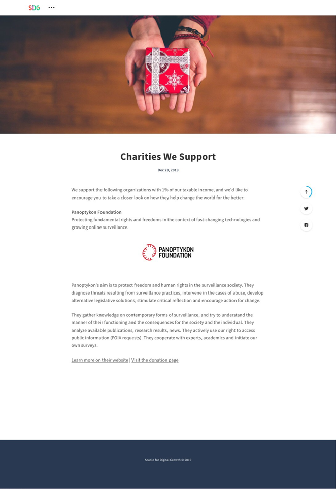 Artykuł 17.02.2020 1 min. czytania Tekst Image Jeżeli zależy Ci na szybkim zwrocie podatku, przypominamy, że od soboty możesz rozliczać się z fiskusem za 2019 rok, a przy okazji wesprzeć Panoptykon 1% [KRS: 0000327613]. A że dwa procenty są lepsze niż jeden, liczymy na Twoją pomoc również w dotarciu do osób, które jeszcze nas nie znają. Do listy pomysłów na to, jak zagaić o 1% dla Panoptykonu, dorzucamy kolejny. Tym razem do zrealizowania w Twoim miejscu pracy. Zaczep znajomych. Intranet, Slack, grupa mailingowa - bez względu na to, z jakich kanałów korzystasz w pracy, na pewno istnieją i takie, w których dzielisz się czymś więcej niż statusem prac nad konkretnym projektem. Wykorzystaj je, żeby powiedzieć innym o Panoptykonie. Pochwal się klientom. Stopka w mailu, newsletter, profil firmy na Linked.inie - zajrzyj, czy w którymś z tych kanałów Twoja firma nie informuje klientów o inicjatywach, które warto wspierać. Może i tam znajdzie się miejsce dla Panoptykonu. Wykorzystaj nasze materiały. Na stronie dedykowanej 1% znajdziesz opis naszych działań i planów oraz szereg argumentów, dlaczego warto nas wspierać. W ramach inspiracji dzielimy się też newsletterem, w którym pewna firma postanowiła opowiedzieć o nas swoim klientom. Daj znać, czy w Twoim miejscu pracy znalazło się miejsce na wzmiankę o Panoptykonie. Dziękujemy! 1% przeznaczysz w tym roku na inną organizację? Nie szkodzi. Równie mocno ucieszymy się z darowizny. Wesprzyj Panoptykon. Maria Wróblewska Autorka Temat Fundacja Panoptykon Poprzedni Następny Newsletter Otrzymuj informacje o działalności Fundacji Twoje dane przetwarza Fundacja Panoptykon w celu promowania działalności statutowej, analizy skuteczności podejmowanych działań i ewentualnej personalizacji komunikacji. Możesz zrezygnować z subskrypcji listy i zażądać usunięcia swojego adresu e-mail. Więcej informacji o tym, jak przetwarzamy twoje dane i jakie jeszcze prawa ci przysługują, w Polityce prywatności. Zapisz się Zapisz się Akceptuję Regulamin usługi Leave this field blank Zobacz także Artykuł RODO i spółka, czyli podsumowanie roku i plany na przyszłość Za nami kolejny pracowity rok. W telegraficznym skrócie opowiadamy o tym, co nas w ostatnich miesiącach pochłaniało, co podnosiło ciśnienie i z czego jesteśmy dumni. Udało nam się osiągnąć kilka ważnych sukcesów, ale wyzwań na styku nowych technologii i wolności przybywa. Więc w kolejnym roku na… 14.12.2018 Tekst Artykuł Gramy w grę Facebooka, żeby zmienić jej zasady Przejrzystość instytucji państwowych i korporacji to jeden z głównych postulatów Fundacji Panoptykon. To także fundament naszej działalności. Dlatego w tym roku postanowiliśmy Was zaprosić za kulisy kampanii jednoprocentowej, którą właśnie rozpoczynamy. Wszystko zaczęło się od odkrycia, że 200 tys… 06.03.2018 Tekst Artykuł Spotkaj się z nami! Zaczynamy sezon debat i spotkań z ekspertami! Będzie nas można spotkać na wielu wydarzeniach, najszybciej w najbliższy wtorek. 26.08.2022 Tekst