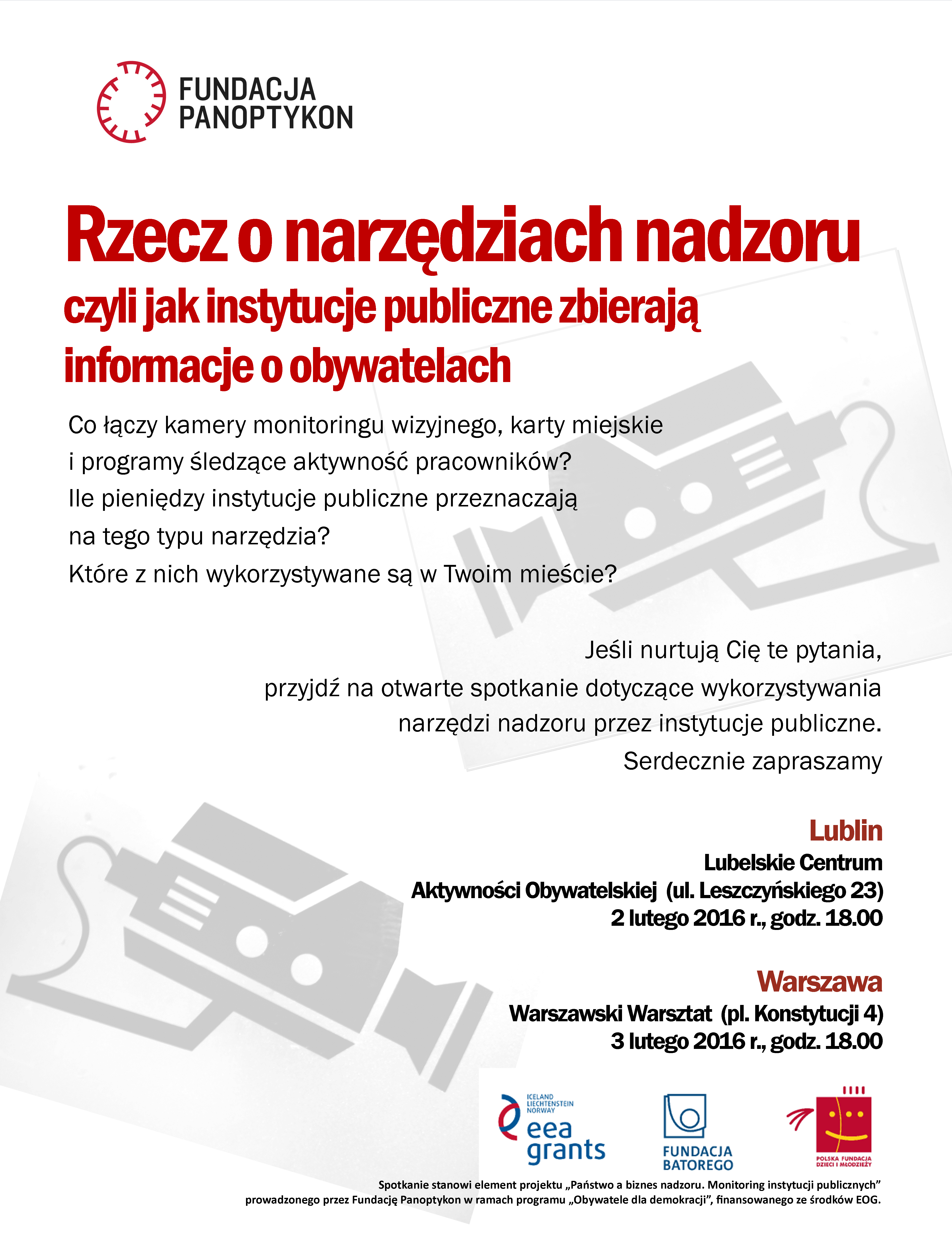 Pierwsze spotkanie o narzędziach nadzoru zorganizowaliśmy w Krakowie na początku grudnia 2015 r., we współpracy z Fundacją Stańczyka i Spółdzielnią Ogniwo. Kolejne odbędą się w lutym w Lublinie i Warszawie. Jeśli interesuje Cię, co łączy kamery monitoringu wizyjnego, karty miejskie i programy śledzące aktywność pracowników, ile pieniędzy instytucje publiczne przeznaczają na tego typu narzędzia, a także to, w jaki sposób informacje zbierane przez różne narzędzia i instytucje są łączone, przyjdź na jedno z organizowanych przez nas wydarzeń: