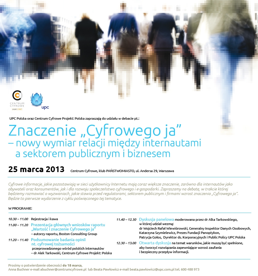 Artykuł 13.03.2013 1 min. czytania Tekst Image Znaczenie „Cyfrowego ja” – nowy wymiar relacji między internautami a sektorem publicznym i biznesem - to tytuł debaty, która odbędzie się w Warszawie 25 marca 2013. W dyskusji panelowej wezmą udział: Generalny Inspektor Ochrony Danych Osobowych dr Wojciech Wiewiórowski, prezeska Fundacji Panoptykon Katarzyna Szymielewicz oraz Dyrektor ds. Korporacyjnych i Public Policy UPC Polska. Zapraszamy w imieniu organizatorów: UPC Polska oraz Centrum Cyfrowego Projekt: Polska. Szczegóły spotkania Anna Obem Autorka Temat Internet Poprzedni Następny Newsletter Otrzymuj informacje o działalności Fundacji Twoje dane przetwarza Fundacja Panoptykon w celu promowania działalności statutowej, analizy skuteczności podejmowanych działań i ewentualnej personalizacji komunikacji. Możesz zrezygnować z subskrypcji listy i zażądać usunięcia swojego adresu e-mail. Więcej informacji o tym, jak przetwarzamy twoje dane i jakie jeszcze prawa ci przysługują, w Polityce prywatności. Zapisz się Zapisz się Akceptuję Regulamin usługi Leave this field blank Zobacz także Artykuł Algorytmiczny eksperyment Facebooka Od 11 stycznia strumień aktualności na Facebooku (podobno) działa na nowych zasadach: treści, które zostały wrzucone przez naszych znajomych albo wywołały ich komentarze mają większą widoczność niż treści generowane przez media i inne strony (także organizacji i ruchów społecznych). Przez… 25.01.2018 Tekst Artykuł Czy prywatność w sieci jest możliwa (i zależy wyłącznie od ciebie)? Prywatność w sieci możliwa jest już dziś. Dużo zależy od naszych codziennych wyborów technologicznych. Choć w przypadku niektórych z nich poprzeczka ustawiona jest dość wysoko, jeśli chodzi o niezbędną wiedzę, to nasze decyzje przy urnach wyborczych i nasz głos w konsultacjach społecznych może… 03.08.2023 Tekst Artykuł Czy internet w ogóle jeszcze służy ludziom? Pora się obudzić Czy ktoś jeszcze pamięta, że w 2009 r. internet był nominowany do Pokojowej Nagrody Nobla? Abstrahując od sensu i polityczności samej nagrody, z perspektywy 2019 r. „pokój” zupełnie nie kojarzy się z tym, czego doświadczamy w sieci. Jesteśmy raczej w stanie wojny: z hejtem, dezinformacją,… 28.04.2019 Tekst