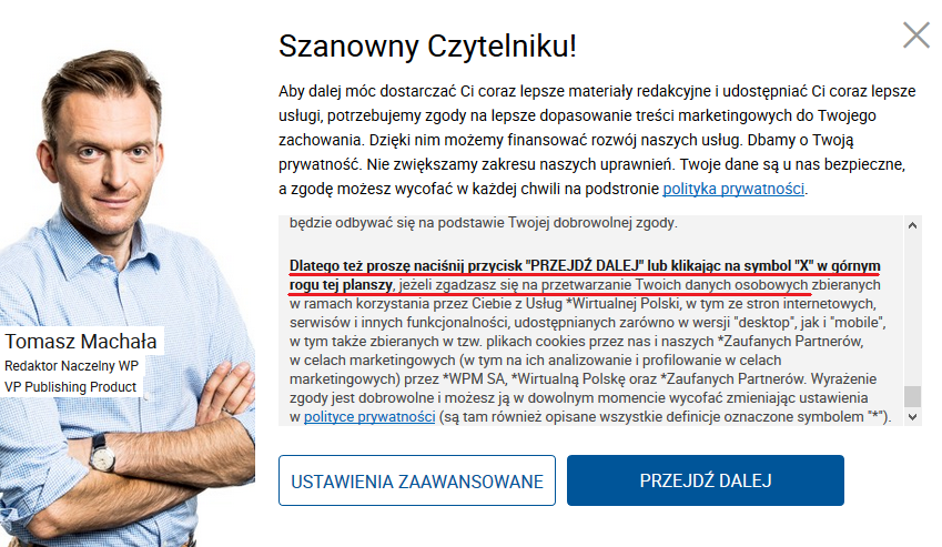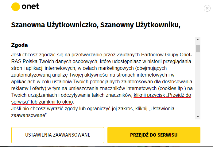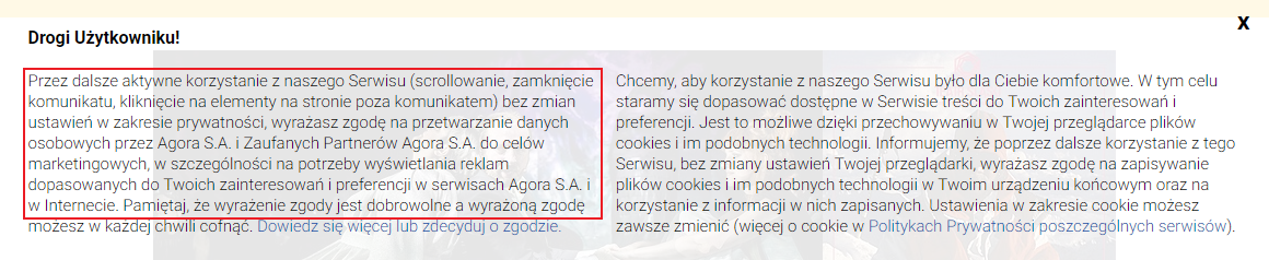 Poradnik 07.06.2018 4 min. czytania Tekst Na czym polega ta praktyka? Portale i sklepy internetowe, które uznały, że mimo wszystko* muszą zbierać zgodę na przetwarzanie danych, szukają takich rozwiązań, które sprawią, że zgód będzie jak najwięcej. Zamiast klasycznego przycisku (checkboxu, suwaka etc.), który wymaga naszego świadomego kliknięcia, informują, że na ich stronie za zgodę na przetwarzanie danych (np. w celach marketingowych) będzie uważane wykonanie innej czynności, np. zamknięcie okienka z informacją o RODO (czyli naciśnięcie znaczku „x”), a nawet kliknięcie kursorem w dowolnym miejscu strony (poza wyświetlanym komunikatem), scrollowanie lub „dalsze, aktywne korzystanie z serwisu, bez zmian ustawień przeglądarki”. *o tym, kiedy pozyskiwanie zgody rzeczywiście jest potrzebne, piszemy w RODO na tacy (odcinek II) Przykłady: Agora: wyrażenie zgody poprzez dalsze korzystanie z serwisu Onet: wyrażenie zgody poprzez zamknięcie okienka Wirtualna Polska: wyrażenie zgody poprzez zamknięcie okienka Jak to się ma do RODO? Zgodnie z RODO „jednoznaczne działanie potwierdzające” to jedna z form wyrażenia zgody. A więc zgodą na przetwarzanie danych jest nie tylko klauzula zaczynająca się od „zgadzam się…”, ale każde inne zachowanie, które w danym kontekście jasno wskazuje, że osoba, której dane dotyczą, zaakceptowała proponowane jej zasady przetwarzania danych osobowych. W praktyce „jednoznaczne działanie potwierdzające” może polegać np. na zaznaczeniu okienka wyboru podczas przeglądania strony internetowej albo kliknięciu na określony przycisk. Takie działanie nie może być jednak przypadkowe (np. kliknięcie obok okienka z informacją o przetwarzanych danych, bez żadnej intencji) ani dwuznaczne. Zamknięcie okienka z informacją o przetwarzanych danych może oznaczać, że użytkownik nie chce jej w tym momencie czytać (a nie, że zgadza się na zaproponowane warunki); przescrollowanie komunikatu na telefonie może oznaczać, że użytkownik po prostu chce go przeczytać, bo w całości nie był widoczny na ekranie. Zgodnie z RODO każda dwuznaczność będzie działać na niekorzyść administratora. W Panoptykonie uważamy, że czynności takie jak zamknięcie informacji o przetwarzanych danych poprzez naciśnięcie znaku „x” (który jest zwyczajowo używany w Internecie do zamykania wyskakujących okienek) lub dalsze przeglądanie strony (takiemu działaniu trudno przypisać inną intencję niż „chcę zobaczyć, co jest dalej”) nie mogą być traktowane jak świadoma, jednoznaczna zgoda. Jak możesz zareagować? Jeśli nie wiesz, czy Twoje dane są przetwarzane (np. dlatego, że nie wykonałaś/-eś żadnej czynności, która mogłaby być uznana za zgodę na ich przekazanie), możesz to sprawdzić, wysyłając wniosek o dostęp do danych. Jeśli widzisz, że firma przetwarza Twoje dane na podstawie niejednoznacznej czynności, którą traktuje jak zgodę, możesz wysłać do niej żądanie ich usunięcia. Firma, która tak robi, tak naprawdę nie ma podstawy prawnej, bo zebrana przez nią „zgoda” jest nieważna. Jeśli to działanie nic nie dało (np. w ciągu 30 dni nikt nie odpowiedział na Twoje żądanie albo odpowiedź Cię nie usatysfakcjonowała), możesz złożyć skargę do Prezesa UODO (lub pozew do sądu). Możesz też od razu przejść do kroków prawnych, RODO nie wymaga wcześniejszego kontaktu z firmą. Zobacz inne praktyki: RODO na tacy. Sezon II: Subiektywny przegląd (złych i dobrych) praktyk. Wspieraj naszą walkę o lepsze prawo ochrony danych! Wpłać darowiznę na konto Fundacji Panoptykon. Fundacja Panoptykon Autor Temat reforma ochrony danych Poprzedni Następny Newsletter Otrzymuj informacje o działalności Fundacji Twoje dane przetwarza Fundacja Panoptykon w celu promowania działalności statutowej, analizy skuteczności podejmowanych działań i ewentualnej personalizacji komunikacji. Możesz zrezygnować z subskrypcji listy i zażądać usunięcia swojego adresu e-mail. Więcej informacji o tym, jak przetwarzamy twoje dane i jakie jeszcze prawa ci przysługują, w Polityce prywatności. Zapisz się Zapisz się Akceptuję Regulamin usługi Leave this field blank Zobacz także Artykuł Powielanie mitów o RODO wywołuje olbrzymie szkody Celem RODO nie jest komplikowanie ludziom życia, ale oddanie im większej kontroli nad danymi. I jeśli przestaniemy się zajmować narzekaniem i mnożeniem absurdów, ten cel nadal można zrealizować. 24.07.2018 Tekst Artykuł Big tech kontra RODO. Jak od 6 lat internetowe korporacje obchodzą to prawo „Zgoda” na śledzącą i profilującą reklamę – czasem zaszyta w regulaminie usługi, innym razem wymuszona na poziomie interfejsu. Możesz też jej nie wyrazić za słoną opłatą. Z okazji 6. 26.04.2024 Tekst Artykuł Prawo do wyjaśnienia decyzji kredytowej: nowa jakość w relacji klient–bank* Ponad 40% Polaków ma kredyt w banku. Dotychczas w relacji z bankiem stawali oni w roli petentów, którzy – starając się o środki, których potrzebują – naturalnie byli w gorszej pozycji. Przejawiało się to m.in. w tym, że banki mogły zażądać od nich wszelkich informacji związanych z ich sytuacją i… 21.03.2019 Tekst
